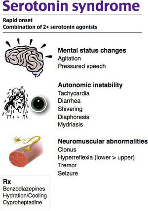 Serotonin syndrome symptoms often begin within hours of taking a new medication that affects serotonin levels or excessively increasing the dose of one you are already taking. Symptoms may include: Agitation or restlessness Dilated pupils Headache Changes in blood pressure and/or temperature Nausea and/or vomiting Diarrhea Rapid heart rate