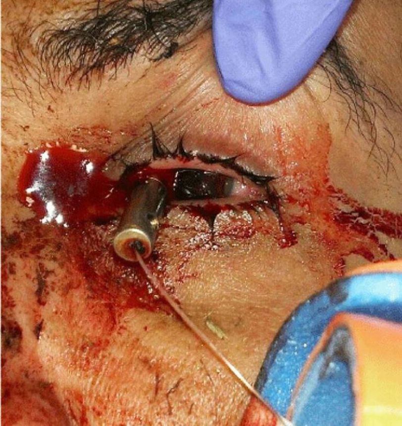 Horrible nightmare - the case of a penetrating globe injury from a taser! This 36 year old male was shot in the left eye with a Taser probe by law enforcement officials. Operative removal and repair of globe was performed, however, the eye is left with poor visual potential. The patient was taken to the operating room for emergent exploration, removal of ocular foreign body, and open globe repair. Conjunctival peritomy was performed to reveal the entry wound at 10 o’clock, approximately 1mm posterior to limbus. Uveal tissue was noted to be prolapsed around the shaft of the foreign body at the entry wound. The Taser probe was carefully removed while attempting to minimize further damage from the barbed tip of the probe. Exploration of the wound after probe removal revealed a piece of white cylindrical plastic within the globe; this was removed and determined to be the ejector sleeve of the Taser probe. Ocular tissue was reposited and the entry wound was closed with nylon suture. An exit wound was not discovered upon globe exploration. One week post-operatively, visual acuity was light perception. The patient continues to have a significant amount of eye pain and is currently being evaluated for enucleation.