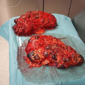 In Polycystic kidney disease, clusters of fluid-filled sacs, called cysts, develop in the kidneys and interfere with their ability to filter waste products from the blood. The growth of cysts causes the kidneys to become enlarged and can lead to kidney failure. The disease frequently affect the kidneys, although patients may develop cysts in other organs such as liver, pancreas, ovaries and spleen. Furthermore, it may even affect the heart or brain. If it affects the patient’s brain, it can hence lead aneurysm. If affects his heart, then the valves may become floppy leading heart murmur. Frequent complications are dangerously high blood pressure (hypertension), pain in the back or sides, blood in the urine (hematuria), recurrent urinary tract infections, kidney stones, and heart valve abnormalities.A non-invasive, reliable and inexpensive diagnosis is made by ultrasound and the treatment is no other than removing the kidneys and performing a transplantation.