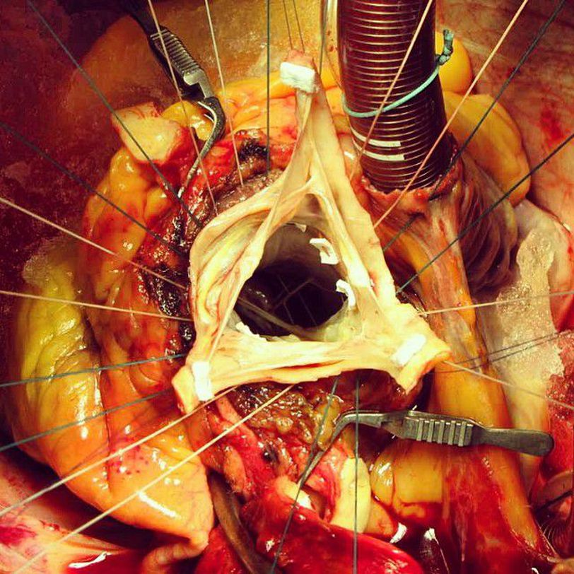 Indications for the replacement can be narrowing of the valve (aortic stenosis) or leaking of the valve (aortic regurgitation). During surgery, a cut is made in the chest to access the heart. The heart is then stopped and a heart-lung bypass machine is used to take over the circulation during the operation.The aortic valve is removed and replaced with an artificial valve (prosthesis).