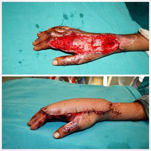 The accident resulted in dorsal composite soft tissue loss over his right hand. Anterolateral thigh free flap was grafted to the right hand dorsum.