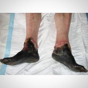 This is the case of a 50-year old homeless man who sustained grade IV frostbite injuries to both feet after sleeping out in sub-zero temperatures. The patient first presented with ischaemic feet with well demarcated areas around the ankle. The feet were left to demarcate and became mummified, then bilateral below knee amputations were performed.