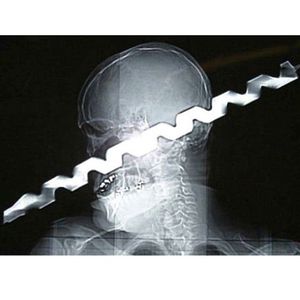 The x-ray of R. Hunt’s skull shows an 18-inch-long drill bit that pierced Hunt’s eye socket and went through his head, just nudging his brain. Hunt, a construction worker, fell off a ladder and landed on the drill he was using at a construction site.