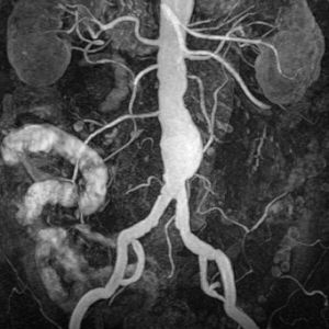 Abdominal aortic aneurysm (enlarged area in the lower part of the aorta) seen by MRI