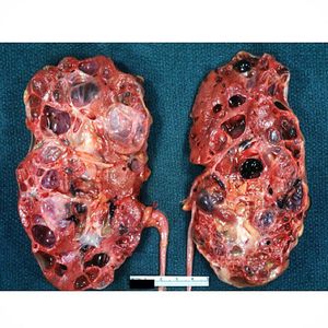Gross natural color hemisections of both kidneys, a typical good example. Cysts are noncancerous round sacs containing water-like fluid. Most common complications are high blood pressure and kidney failure.