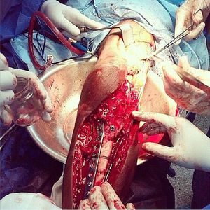 The reduction and fixation of the bone fracture (Osteosynthesis) with implantable device made of metal was done by an open approach to the fractured tibia. Basically, Osteosynthesis aims to bring the fractured bone ends together and immobilize the fracture site while healing takes place.
