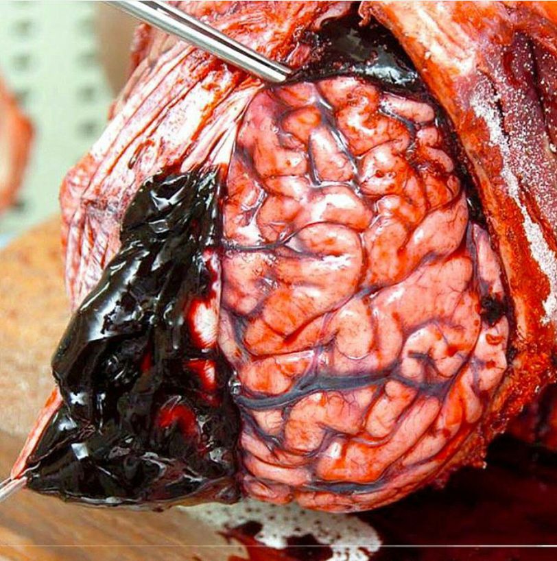 A subdural hematoma is among the deadliest of all head injuries. The bleeding fills the brain area very rapidly, compressing brain tissue. It occurs not only in patients with severe head injury but also in patients with less severe head injuries, particularly those who are elderly or receiving anticoagulants. In a chronic subdural hematoma, small veins on the outer surface of the brain may tear, causing a gradual and slow bleeding in the subdural space, which can hide symptoms for several days or weeks.Small subdural hematomas can be managed by careful monitoring until the body heals itself. Other small subdural hematomas can be managed by inserting a temporary small catheter through a hole drilled through the skull and sucking out the hematoma. The big ones require surgery. This picture shows the skull wide open with the brain completely exposed after performing a craniotomy and the hematoma being carefully evacuated.