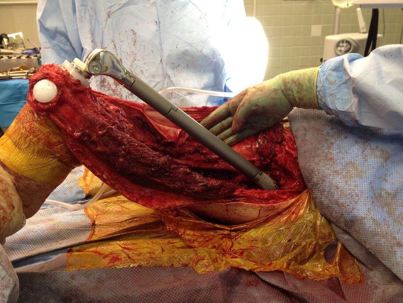This surgery, also knows as femur arthroplasty, is commonly done after a neoplastic involvement of the bone. It represents an important surgical option in limb salvage reconstruction, with most recognized applications in oncologic reconstruction. In the past, patients with cancer of the femur were advised to undergo a hip disarticulation or transfemoral amputation. It is now feasible to salvage the limb in selected patients, by excising the entire femur together with any contiguous soft tissue tumor and replacing it with an endoprosthesis.This patient suffered from a chondrosarcoma, an aggressive cancer that may occur in any bone, especially the pelvic, shoulder and lower limb bones. It is resistant to chemotherapy and radiotherapy, which makes it challenging to deal with and makes surgery mandatory. A limb-sparing operation, seen above, is done in such cases when amputation is avoidable.