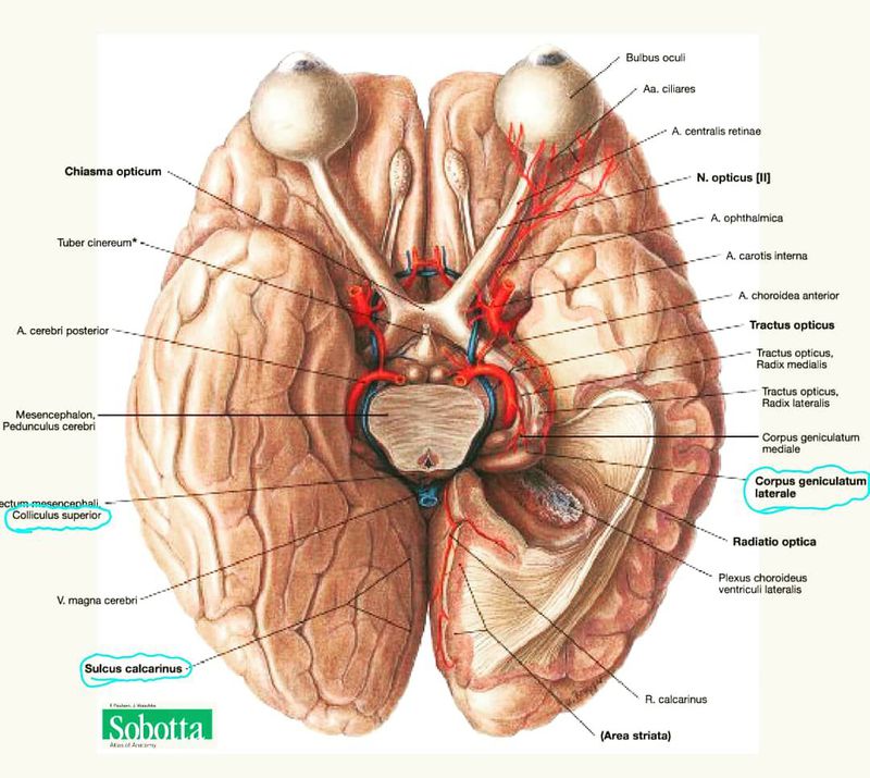 Зрительные центры в головном мозге 🧠: 👀 Первичные зрительные центры: верхние бугры четверохолмия, подушка таламуса , латеральное коленчатое тело. ( 𝒄𝒐𝒍𝒍𝒊𝒄𝒖𝒍𝒖𝒔 𝒔𝒖𝒑𝒆𝒓𝒊𝒐𝒓, 𝒑𝒖𝒍𝒗𝒊𝒏𝒂𝒓 𝒕𝒉𝒂𝒍𝒂𝒎𝒊, 𝒄𝒐𝒓𝒑𝒖𝒔 𝒈𝒆𝒏𝒊𝒄𝒖𝒍𝒂𝒕𝒖𝒎 𝒍𝒂𝒕𝒆𝒓𝒂𝒍𝒆). 👀Корковый конец зрительного анализатора ➡️ в области шпорной борозды (𝒔𝒖𝒍𝒄𝒖𝒔 𝒄𝒂𝒍𝒄𝒂𝒓𝒊𝒏𝒖𝒔). 🙂