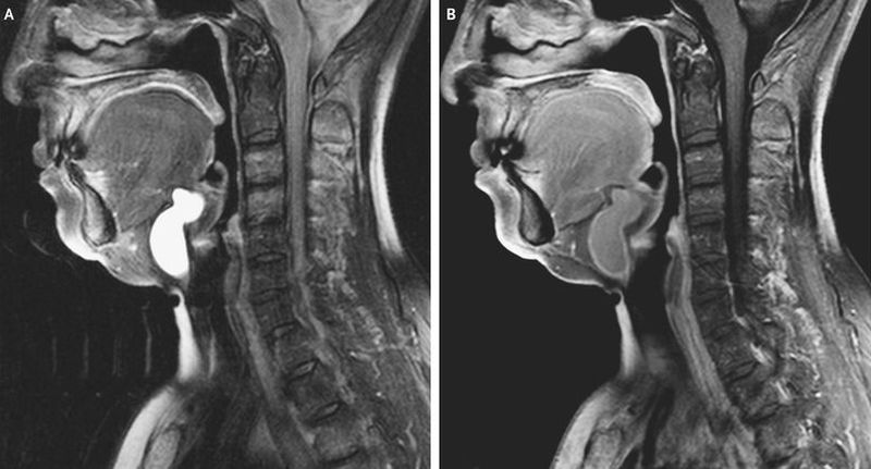 A 68-year-old woman presented to the otorhinolaryngology clinic with a 5-year history of swelling in the neck and the recent development of discomfort when she swallowed. On physical examination, she had a soft and nontender mass in the midline of the neck that moved with protrusion of the tongue and swallowing. Examination with a nasopharyngoscope was normal, and ultrasonography of the neck showed a normal-appearing thyroid gland. Sagittal T2-weighted magnetic resonance imaging (MRI) of the neck revealed a hyperintense cyst in the midline, posterior to the hyoid bone and anterior to the thyroid cartilage (Panel A). T1-weighted MRI with gadolinium enhancement revealed a well-encapsulated cyst that contained fluid (Panel B). A thyroglossal duct cyst, the most common congenital cyst of the neck, was diagnosed. The patient underwent surgical removal of the cyst, and pathological examination showed no evidence of associated infection. The patient did well after surgery and had complete resolution of her presenting symptoms.