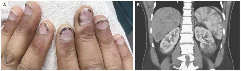 A previously healthy 48-year-old man presented to the emergency department with acute onset of pain in both flanks. During the preceding 6 months he had had an unintentional weight loss of approximately 5 kg. Numerous splinter hemorrhages were observed on the fingernails of both hands (Panel A). No cardiac murmur was heard, but the abdomen was tender and the spleen was palpable below the left costal margin. Blood cultures were drawn, and antibiotic treatment was initiated for suspected bacterial endocarditis. A transesophageal echocardiogram showed mobile echogenic foci on the tricuspid and mitral valves. Computed tomography of the abdomen revealed a mass in the neck of the pancreas, multiple liver lesions, and multiple hypodensities in the spleen and kidneys, which were consistent with infarcts (Panel B). Examination of a biopsy specimen of a liver lesion revealed pancreatic adenocarcinoma. Blood cultures and serologic tests for organisms known to cause culture-negative infective endocarditis were negative. A diagnosis of nonbacterial thrombotic endocarditis associated with metastatic pancreatic cancer was made. Anticoagulation therapy with low-molecular-weight heparin was initiated, as was chemotherapy. The patient’s flank pain, peripheral stigmata of endocarditis, and cardiac-valve thrombi resolved. However, 7 months after diagnosis, he died from complications of progressive pancreatic cancer.