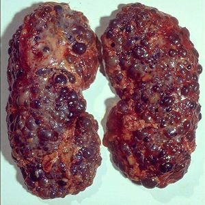 Polycystic kidney disease: an inherited autosomal dominant disease that shows groups of cysts in the kidneys (fluid-filled sacs).
