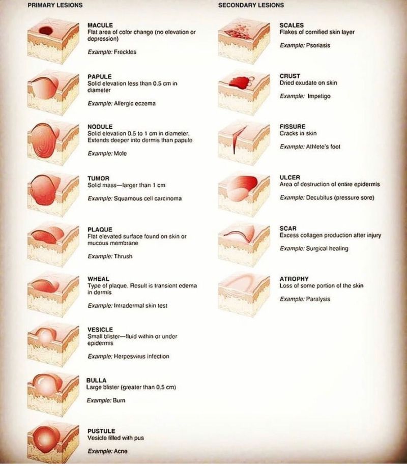 Different type of skin lesions. Primary lesions Bulla-a vesicle (see definition below) greater than 5 mm in diameter Cyst-an elevated, circumscribed area of the skin filled with liquid Macule-a flat, circumscribed area; can be brown, red, white, or tan Nodule-an elevated, firm, circumscribed, and palpable area greater than 5 mm in diameter; can involve all skin layers Papule-an elevated, palpable, firm, circumscribed area generally less than 5 mm in diameter Plaque-an elevated, flat-topped, firm, rough, superficial papule greater than 2 cm in diameter; papules can coalesce to form plaques Pustule-an elevated, superficial area that is similar to a vesicle but filled with pus or semisolid fluid Vesicle-an elevated, circumscribed, superficial, fluid- filled blister less than 5 mm in diameter Wheal-an elevated, irregularly shaped area of cutaneous edema; wheals are solid, transient, and changeable, with a variable diameter; can be red, pale pink, or white. Secondary lesions Crust-a slightly elevated area of variable size; consists of dried serum, blood, Excoriation-linear scratches that may or may not be denuded purulent exudate or Lichenification-rough, thickened epidermis; accentuated skin markings caused by rubbing or scratching (eg, chronic eczema and lichen simplex) Scale-heaped-up keratinized cells; flakey exfoliation; irregular; thick or thin; dry or oily; variable size; can be white or tan.