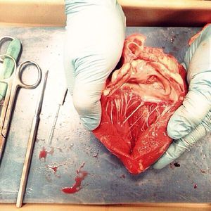 Heart dissection revealing a beautiful look inside that machine, exposing the chambers along with chordae tendinae which are attached to papillary muscles.