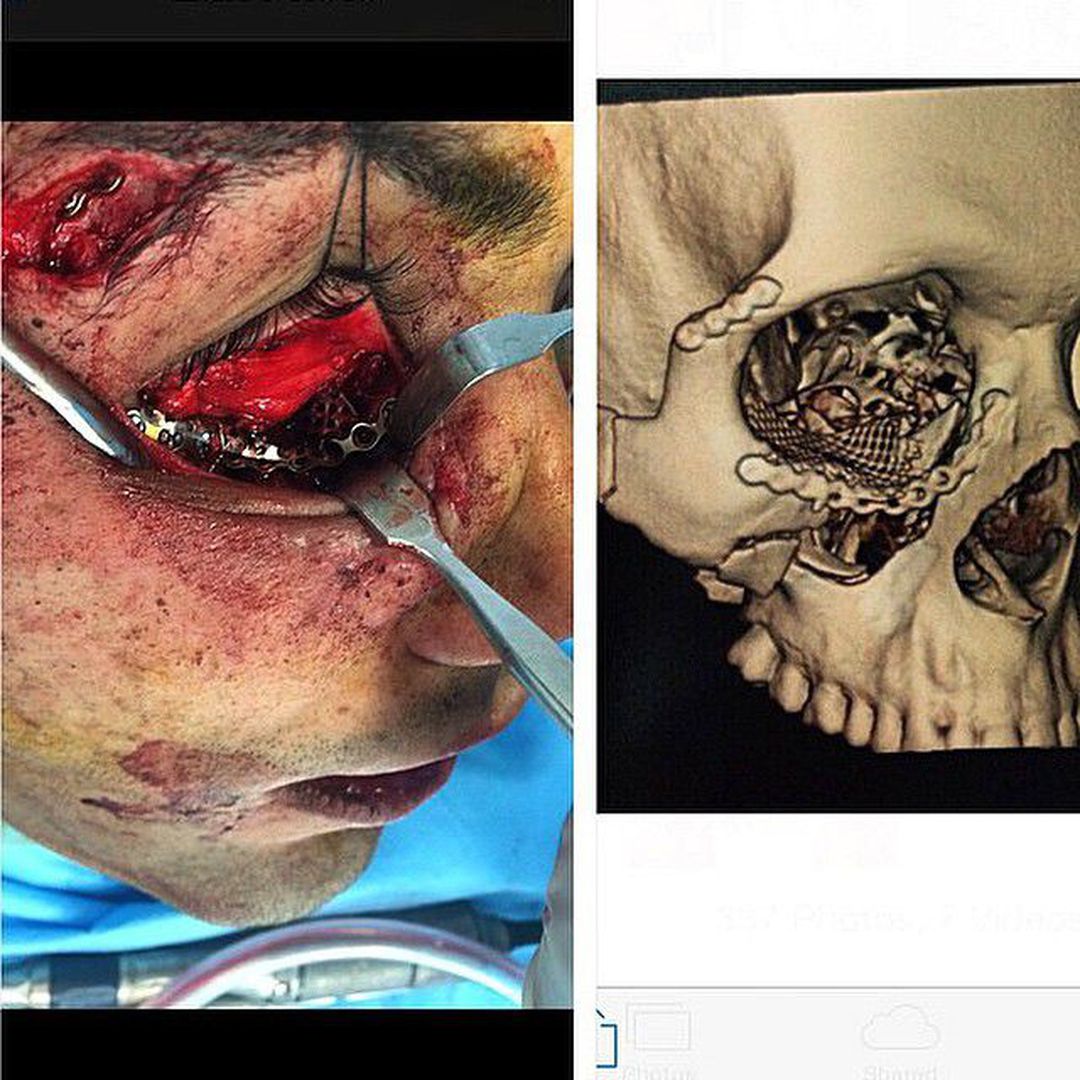 The postoperative photo of the previous case, after fixation with a mini plate in the orbital rim and zygomatico frontal suture. Titanium mesh was used for prevention and separation of the orbital content from entering the maxillary sinus.