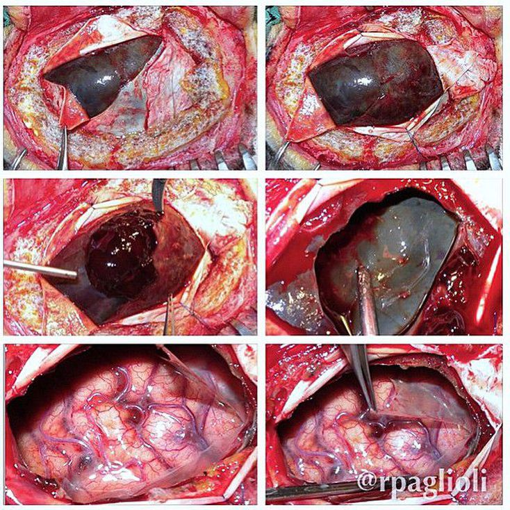 Do you know how a chronic subdural hematoma surgery is going?! Let's get into it, step by step! Generally speaking, a chronic subdural hematoma is an "old" collection of blood and blood breakdown products between the surface of the brain and its outermost covering (the dura). It begins several weeks after the first bleeding.So, from top to bottom, steps 1 and 2 shows the opening of the dura mater to reveal the hematoma's capsule; 3 - resection of the external layer of the hematoma; 4 - drainage of the blood clots inside the capsule of the hematoma, revealing the internal layer beneath it; 5 and 6 - resection of the internal layer and exposition of the brain and arachnoid. This type of hemorrhage usually occurs in elderly people in use of anticoagulants or antiplatelet agents who suffer a head trauma, resulting in the damage of the bridging veins between the brain and dura mater, and slow accumulation of venous blood for weeks or months, eventually forming these capsules and clots compressing the brain to cause further damage. Sent by a neurosurgery resident @rpaglioli