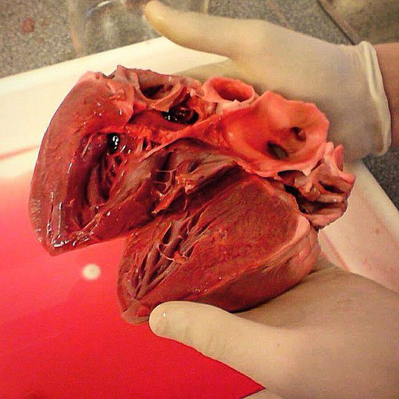 Hypertrophic cardiomyopathy is a condition in which the heart muscle becomes thick, especially of the ventricles (lower heart chambers), which is seen very clearly in this picture. The average left ventricular wall thickness in normal adults is 1.1 cm, but there are exceptions. Trained athletes have hearts that have left ventricular mass up to 60% greater than untrained subjects, with an average left ventricular wall thickness of 1.3 cm.The most common cause is hypertension. As many as 1/3 of patients show left ventricular hypertrophy of any degree along with hypertension. Symptoms include dyspnea (shortness of breath) due to stiffening and decreased blood filling of the ventricles, exertional chest pain (angina) due to reduced or restricted blood flow to the coronary arteries, uncomfortable awareness of a fluttering or pounding heart beat (palpitations) due to the ischemia to the heart muscle, disruption of the electrical system running through the abnormal heart muscle, lightheadedness, fatigue, fainting (called syncope) and sudden cardiac death.Treatment depends on the cause. Athletic hypertrophy does not require any treatment, they're simply advised to stop exercising for a few months to measure their left ventricle again. Hypertensive LVH is treated by controlling the blood pressure with medications and lifestyle changes.