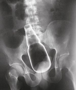 This X-ray belongs to a 35-year-old man who presented to the emergency department with profuse rectal bleeding, abdominal pain, and an altered mental status. He was found intoxicated with a low blood pressure of 70/40 mm Hg and a foreign body was found on rectal examination but was not visible and no evidence of trauma was detected. Once the patient was hemodynamically stable, he was sent to be X-rayed and what was found was shocking as far as it can get to. An intact bottle was seen in the rectosigmoid colon. Laparotomy revealed a glass bottle of beer lodged in the sigmoid colon, with multiple associated lacerations in the rectosigmoid colon. The bottle was removed in surgery, and the man was treated with antibiotics and pain relievers after which he recovered uneventfully.