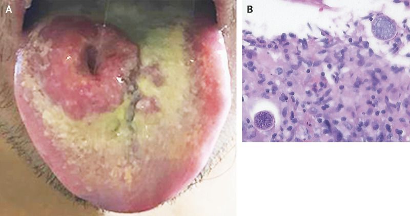A 34-year-old man with a history of human immunodeficiency virus (HIV) infection presented to the emergency department with a 1-week history of headache, fever, and confusion. His temperature was 39.3°C, and on physical examination a large, ulcerative lesion was noted on his tongue (Panel A). The patient’s CD4 count was 39 cells per cubic millimeter (reference range, 500 to 1450), and his HIV viral load was 197,000 copies per milliliter. A chest radiograph showed patchy infiltrates in both lungs. IgG antibodies to coccidioides were detected in the blood and cerebrospinal fluid (CSF), and coccidioides antigen was detected in the blood, CSF, and urine and in fluid obtained on bronchoalveolar lavage. A biopsy specimen of the tongue lesion was obtained, and staining with hematoxylin and eosin revealed multiple fungal organisms consistent with coccidioides spherules (Panel B). Coccidioides was also noted in fungal cultures of fluid obtained on bronchoalveolar lavage. Antifungal treatment was initiated; a combination of liposomal amphotericin B and fluconazole was administered for 2 weeks, followed by fluconazole monotherapy. HIV genotype testing revealed resistance to one of the medications the patient was taking, and the antiretroviral regimen was adjusted. At follow-up 3 months after presentation, the patient’s fever and headache had resolved, the tongue lesion had decreased in size, and the HIV viral load had become undetectable. He was subsequently lost to follow-up.