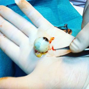 This is an eye enucleation after death, which is the removal of the eyeball that leaves the eye muscles and remaining orbital contents intact. This is done for the purpose of donation, the most common is the cornea, which can be harvested up to twelve hours after death, but ideally within six hours. Eye banks are the institutions responsible for collecting (harvesting) and processing donor corneas, and for distributing them to trained corneal graft surgeons. Cornea harvesting is the surgical removal from a deceased person of either the whole eye (enucleation) or the cornea (in situ corneal excision) for different medical uses in order to improve visual acuity, to reconstruct and to improve the appearance of patients with corneal scars that have given a whitish or opaque hue to the cornea.Photo credit - @joaquinmac
