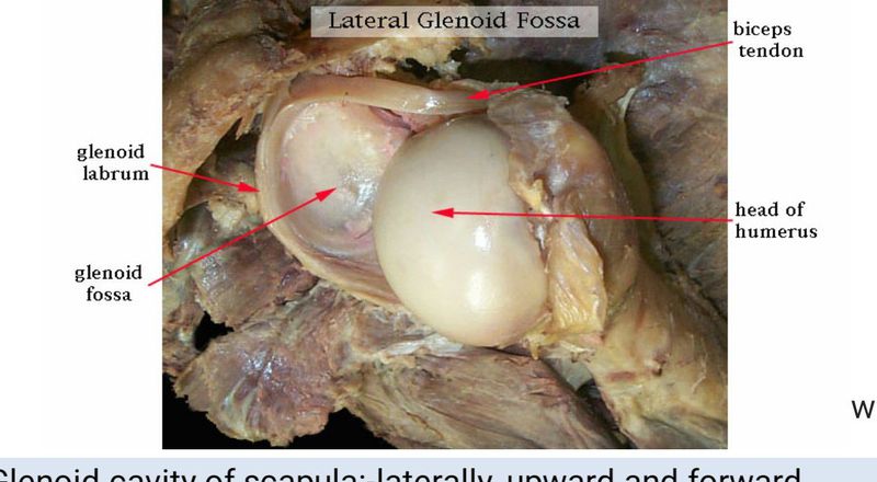 Shoulder joint - Ball and socket variety of joint. Attachment of various muscles. Syonvial joint. Formed by articulation of head of humerus in glenoid cavity of scapula. Antrioinferior dislocation is common. Stabilized by ligaments,muscles,musculotendnous cuff,coracoacromial arch,glenoid labrum and atmospheric pressure. Movements~flexion,extension,adduction,abduction,medial and lateral roatation,and circumduction. Clinical-frozen shoulder,dislocation.