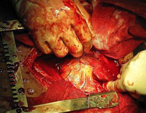 This patient was stabbed in the left anterior chest wall, 5th intercostal space, 1cm medial to midclavicular line. He was in shock with neck vein distension. FAST (Focused assessment with sonography for trauma) showed pericardial fluid, meaning that he was suffering from a ventricular wall laceration/tearing, and blood was leaking though it. Ventricular repair, or cardiorrhaphy, has long been one of the most dramatic and lifesaving procedures performed in the emergency department. In this photo, Index finger was placed on the actively bleeding site of injury and the laceration was repaired with 4-0 prolene via a pledget.
