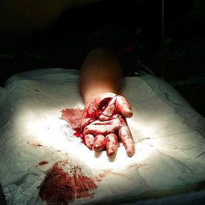 Laceration is a cut, a deep cut in skin that is produced by the tearing of soft body tissue. This type of wound is caused by a sharp object (such as a knife in this case or a shard of glass) and almost always leads to the injury of deeper structures under the skin such as vessels and nerves, and more rarely to tendons and bones. The mechanism of injury can raise any suspicious of a nerve injury. In some cases, a simple bruise or swelling around the nerve will cause numbness or tingling for a few days. After this, normal feeling and function return. If the feeling doesn’t return within 10 days, the nerve has likely been cut.A deep cut may be closed with stitches (sutures) or skin glue. Skin glue is used on cuts that have smooth edges and are not very deep and infected. This case requires surgical repair and application of stitches.