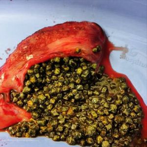 Gallstones are very frequent finding following cholecystectomy (surgical resection of the gallbladder) and there can be as many as hundreds of them!These are hardened deposits of digestive fluid that can form in the gallbladder that can eventually block the exiting bile ducts and cause sudden, severe abdominal pain, known as biliary colic. They range in size from as small as a grain of sand to as large as a golf ball.