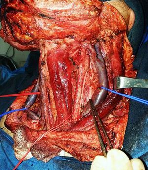 The patient is a 21 years old female that was diagnosed with a bilateral non-toxic multi-nodular goiter. The term non-toxic goiter refers to enlargement of the thyroid that is not associated with overproduction of thyroid hormone or malignancy. It does not result from an inflammatory or neoplastic process and is not associated with abnormal thyroid function. The thyroid can become very large so that it can easily be seen as a mass in the neck. These patients will typically complain of a cough, a slight change in voice, or nighttime choking episodes because of the way that the gland compresses the trachea while sleeping.The enlarged gland can even compress the blood vessels of the neck, which is also an indication for its removal. In the above image, notice the following visible structures, such as the common carotid artery (red), internal jugular vein (blue), left sternocleidomastoid muscle (retractor), and sternohyoid muscle. Photo by : @teukunandap