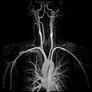 This is a truly unique test that views our body's remarkable complexity in such a simplistic way. The MRA uses magnetic field, radio waves and a computer to evaluate blood vessels and help identify abnormalities or detect aneurysms, dissections, ruptured and atherosclerotic disease of the aorta and all its branches. Unlike traditional angiography that involves placing a tube (catheter) into the body, MRA is noninvasive and requires contrast in order to visualize the blood vessels. Notice the heart along with the aorta, aortic arch, and its 3 main branches (brachiocephalic trunk, left common carotid artery, and left subclavian artery).
