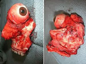 Photographs showing an entire orbitocranial-orbitomaxillary complex after en bloc resection! This 30-year-old man had a several-month history of nasal congestion, as well as right airway obstruction treated using over-the-counter nose sprays and allergy medications. Subsequently, he began to develop right-sided orbital pain and headache. He underwent endoscopy of the sinus, and an intranasal mass was demonstrated. The sinonasal endoscopy demonstrated a large friable granular mass filling the posterior and superior right nasal cavity. A biopsy sample was obtained, and examination revealed basaloid-squamous cell carcinoma. A CT study of the sinuses revealed a soft-tissue mass and erosion of the medial wall of the right orbit and cribriform plate. An MR imaging study suggested orbital and cranial invasion. It was decided to surgical excise the tumor and the surgical defect required a free-flap reconstruction.