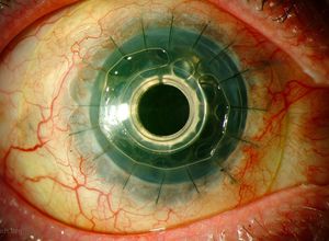This is how a keratoprosthesis looks like, more precisely, a Boston type 1 keratoprosthesis! During this surgical procedure, a diseased cornea is replaced with an artificial cornea. Traditionally, keratoprosthesis is recommended after a person has had a failure of one or more donor corneal transplants.The Boston Type I Keratoprosthesis is a prosthetic corneal replacement used to restore vision in individuals with severe corneal disease and contraindications to traditional keratoplasty techniques. Keratoprotheses are made of clear plastic with excellent tissue tolerance and optical properties. They vary in design, size and implantation techniques.One negativity is the risk for infection. Fungal infections may occur around the device stem and appear milky-white or reddish.