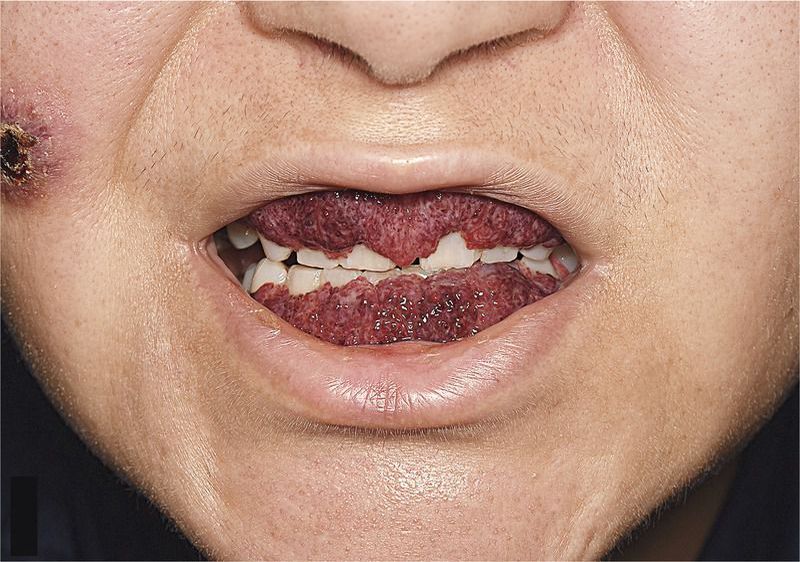 A 42-year-old woman presented to the dermatology clinic with a 6-week history of rapidly progressive, painful gingival hyperplasia. She had recurrent epistaxis, and three necrotic ulcers had developed on her face over the previous 4 weeks. An oral examination revealed gingival hyperplasia with a granular and hemorrhagic appearance typical of “strawberry gingivitis.” Laboratory test results showed an elevated titer of antineutrophil cytoplasmic antibodies with a cytoplasmic staining pattern (c-ANCA), and an enzyme-linked immunosorbent assay for anti–proteinase 3 antibodies was positive. The serum creatinine level and urinalysis results were normal. Computed tomography of the head and chest revealed normal paranasal sinuses and multiple pulmonary nodules. A diagnosis of granulomatosis with polyangiitis was established on the basis of these clinical and laboratory findings. Strawberry gingivitis is a rare manifestation of granulomatosis with polyangiitis, and its clinical presentation is highly suggestive of the disease. The patient initiated treatment with prednisolone and cyclophosphamide but was lost to follow-up.