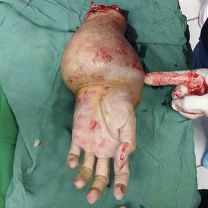 Surgeons performed a below-elbow amputation due to probability of malignancy and fast growth of the tumor which caused a complete destruction of the bone and soft tissue surrounding it. Giant-cell tumor of bone is a type of benign (noncancerous) tumor that grows at the ends of the body's long bones. Although giant cell tumors are not cancerous, they are aggressive and can destroy the surrounding bone.It is a relatively uncommon tumor of the bone and characterized by the presence of multinucleated giant cells (osteoclast-like cells) seen on microscope. Malignancy is uncommon and occurs in about 2% of all cases, and when it does occur, it usually metastasizes to the lungs. Treatment for a giant cell tumor almost always involves surgery to remove the tumor or amputation and prevent further damage to the bone near the affected joint.Photo credit @kenzanity