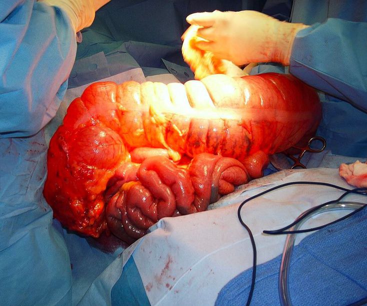 Pay attention to how massive this colon is compared to the small intestine! This isn't just a colon, it's a super duper megacolon!!! A megacolon denotes dilation of the colon that is not caused by mechanical obstruction. The common and useful measurement for diagnosing it is when the cecum is greater than 12cm (normally varies between 6-9 cm), the rectosigmoid region greater than 6.5 cm and the ascending colon greater than 8 cm. A congenial megacolon is called Hirschsprung's disease, in which nerve cells of the myenteric plexus are absent, it typically affects babies, and therefore isn't the case here. On the other hand, a toxic megacolon is a life-threatening complication that occurs in association with a severe attack of inflammatory bowel disease such as ulcerative colitis, Crohn's disease or an infection with Clostridium difficile. It is characterized by swelling and dilation of the large intestine due to inflammation and accumulation of excessive amounts of gas. Further complications like septic shock, hemorrhage and peritonitis rarely occur. The goal of the treatment is to decompress the bowel and to prevent swallowed air from further distending the bowel. A colectomy (surgical resection of all or part of the colon) is usually indicated if megacolon worsens.