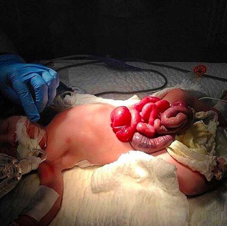 This picture shows a rare birth defect known as gastroschisis! It's a congenital defect of the anterior abdominal wall in which the baby's intestines and content freely protrudes out of the abdominal cavity due to failure of the abdominal wall to develop probably after the disruption of the blood supply to the wall.The small and large bowel, stomach, and often the fallopian tube/ovary/testis herniate through the defect. This case necessitates urgent repair. Small defects may be closed primarily after manually stretching the abdominal cavity. Basically, the accompanied bowel wall edema subsides within a couple of days and the bowel readily reduces back into the abdominal cavity, after which the wall can be surgically closed.