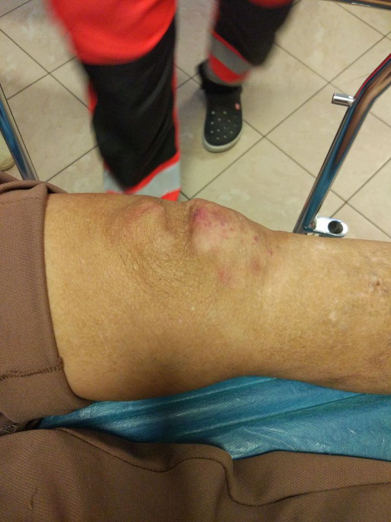 Here is photo of broken patella. Patient, 85 y.o. woman fall from chair. She is taking anticoagulants, so after arriving to the E.R. she should have oedema, but paramedics transported her on sitting position - whole road she had bent knee. After 10 minutes (when already she had straight leg) oedema came and this interval wasn't visible.