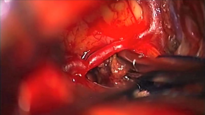 This is a trans-lamina terminalis route via a pterional craniotomy for resection of craniopharyngioma. Many other approaches can be used to remove such tumors. These other approaches include a transbasal subfrontal trans-lamina terminalis craniotomy, and the endonasal approach. A craniopharyngioma is benign tumor. This type of tumor grows in the sellar or suprasellar region within the skull. One main structure of the brain that this tumor grows is the pituitary gland and stalk. Additionally, one symptom of this tumor can be bitemporal hemianopia.