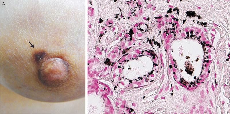 A 62-year-old woman presented to the breast-surgery clinic with stiffness of the left nipple. Palpation of the left breast, mammography, and ultrasonography revealed no abnormalities. However, a pigmented macule that measured 5 mm in the greatest dimension was noted on the left areola (Panel A, arrow). The patient was referred for areolar skin biopsy. Histopathological examination revealed invasive adenocarcinoma in the dermis. On immunohistochemical testing, the cancer cells were strongly positive for estrogen and progesterone receptors and negative for human epidermal growth factor receptor type 2. The glands within the intradermal cancerous lesion were colonized by melanocytes with heavy deposits of melanin granules (Panel B, Fontana–Masson stain). Melanocytic colonization of breast cancers with attendant pigmentation may occur microscopically and can occasionally manifest as skin changes. In this case, the carcinoma arose in the nipple, and conventional breast imaging was not effective for tumor detection. The patient underwent a partial mastectomy, and pathological examination revealed an invasive ductal carcinoma, measuring 9 mm in the greatest dimension, in the nipple. There was no evidence of metastasis. The patient received antiestrogen therapy and underwent radiotherapy. At last follow-up, 10 months after the initiation of treatment, she remains well, with no further symptoms