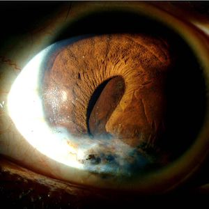 Patient had suffered a penetrating injury with a pencil to the left eye as a child, that was surgically repaired. She was ok untill 3 weeks ago when she was diagnosed with an iris epithelial inclusion cyst. Iris cysts can be classified as primary or secondary. Primary cysts have no known cause and arise from the iris pigment epithelium or stroma. Secondary iris cysts can form as a result of epithelial inclusion, as a response to medication such as prostaglandin analogues or indirect acting cholinergic agonists or from cysticercus infection.