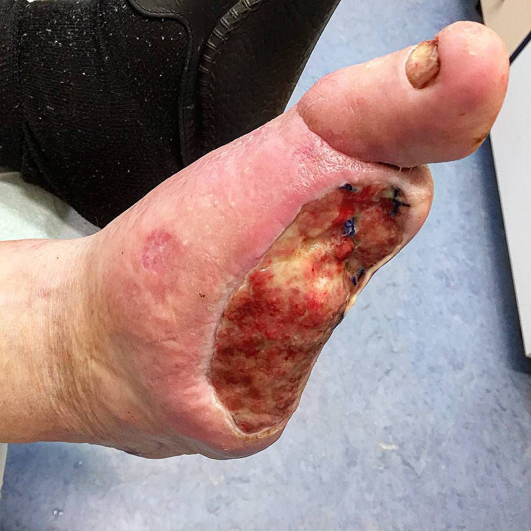 A diabetic foot is a foot that exhibits any pathology that results directly from diabetes mellitus or any chronic complication of diabetes mellitus. Presence of several characteristic diabetic foot pathologies such as infection, diabetic foot ulcer and neuropathic osteoarthropathy is called diabetic foot syndrome (due to the peripheral nerve dysfunction, patients have a reduced ability to feel pain).