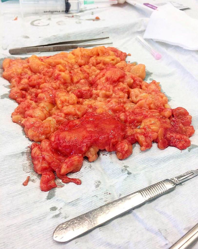 This is what we got out of a lipoma today. It was a 50 year old patient with an enormous bump on his upper back.A lipoma is a benign tumor composed of adipose tissue (body fat). It is the most common benign form of soft tissue tumor. Lipomas are soft to the touch, usually movable, and are generally painless. Many lipomas are small (under one centimeter diameter) but can enlarge to sizes greater than six centimeters. Lipomas are commonly found in adults from 40 to 60 years of age, but can also be found in younger adults and children.Usually, treatment of a lipoma is not necessary, unless the tumor becomes painful or restricts movement. They are usually removed for cosmetic reasons, if they grow very large, or for histopathology to check that they are not a more dangerous type of tumor such as a liposarcoma.[3] This last point can be important as the characteristics of a "bump" are not known until after it is removed and medically examined.Lipomas are normally removed by simple excision. The removal can often be done under local anaesthetic, and takes less than 30 minutes. This cures the great majority of cases, with about 1–2% of lipomas recurring after excision. Liposuction is another option if the lipoma is soft and has a small connective tissue component. Liposuction typically results in less scarring; however, with large lipomas it may fail to remove the entire tumor, which can lead to regrowth.New methods under development are supposed to remove the lipomas without scarring. One is removal by injecting compounds that trigger lipolysis, such as steroids or phosphatidylcholine.