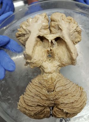 In this posterior view of formaline-preserved beautifully dissected brain, we can easily see some usualy hard-to-see structures! Starting from the bottom of the picture, we can find two cerebellar hemispheres with thin folia - wrinkles on the surface (in cerebrum they are known as gyri). Cerebellum is conected to the brain stem, from which here we can only see mesencephalon (midbrain) with its superior and inferior colliculi which are part of the tectum. By resecting the majority of cerebral grey and white matter, ventricules are opened. Two lateral ventricles are visible - their central part and anterior horn going further into frontal lobe. Right in between two lateral ventricles - septum pellucidum makes medial wall, and as a lateral border - nucleus caudatus is visible. Furthermore, there is third ventricle sorounded by thalamus on each side. In the very bottom of the third ventricle we can detect carebral aqueduct (aq. mesencephali or Sylvi) leading to (here not visible) fourth ventricle. Notice small anterior part (what is left of) corpus callosum (and its corona radiata) connecting two hemispheres.