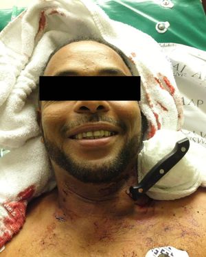 He came in with completely stable vital signs. He had no neurological deficits and he was only in a little bit of pain. It was quite remarkable. The knife was stuck so deep that the assailant couldn't pull it out. The CTA showed that the knife was imbedded in his clavicle on the opposite side. It missed all of his important vascular structures. Lucky for him, it also missed his trachea. We took him to the operating room thinking it was going to be easy to pull it out, but we got a little surprise. It was stuck into his clavicle like the sword in the stone. I was pulling so hard on it that it literally lifted his shoulders off the operating table. Then I wisened up and grabbed his clavicle with one hand and wiggled the knife out with the other. You're really not supposed to wiggle knives out because you might cause more damage, but I had seen the CTA and knew that it wasn't sitting close enough to anything too important. Once it finally came out, we had to explore the wound to tie off the bleeding vessels. It turns out, the knife went through both of his anterior jugular veins. We got control of those pretty easily and the guy walked out of the hospital 2 days later. He was still smiling.Credit: Cape Town trauma