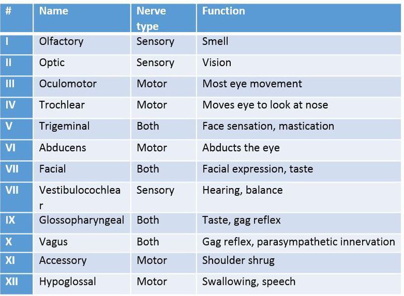 The cranial nerves are 12 pairs of nerves that can be seen on the ventral (bottom) surface of the brain. Some of these nerves bring information from the sense organs to the brain; other cranial nerves control muscles; other cranial nerves are connected to glands or internal organs such as the heart and lungs.
