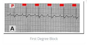 First degree: the PR interval is >0.20 (usually benign, monitor for possible new arrhythmias)… Remember to measure those PR intervals!