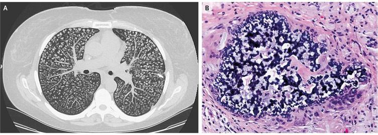 A 31-year-old woman who was receiving long-term total parenteral nutrition after having undergone Roux-en-Y gastric bypass that was complicated by small-bowel resection presented to the pulmonology clinic with exertional dyspnea that had progressed over the course of 1 year. She had normal oxygen saturation while breathing ambient air and was not in respiratory distress. Breath sounds were normal in all lung fields, with no wheezing, ronchi, or crackles. Computed tomography of the chest revealed diffuse, innumerable centrilobular nodules in both lungs (Panel A). A lung-biopsy sample obtained by video-assisted thoracoscopic wedge resection revealed perivascular aggregates of histiocytes and foreign-body giant cells with abundant basophilic foreign material in coral-like structures (Panel B). The material was confirmed by mucicarmine staining to be crospovidone, an inactive ingredient present in many oral medications. The patient received a diagnosis of pulmonary foreign-body granulomatosis, which can occur after injection or nasal inhalation of pulverized tablets, often opioids or stimulants, that contain inert fillers such as crospovidone, talc, or cellulose. She reported that she had been using the vascular access for her total parenteral nutrition to inject oral opiates that had been previously prescribed for her after abdominal surgery. Although the best available treatment for pulmonary foreign-body granulomatosis has not been established, treatment of the underlying opioid-use disorder is critical. At follow-up 6 months after the patient’s initial presentation (3 months after diagnosis), her dyspnea remained unchanged and was not limiting her daily functioning.