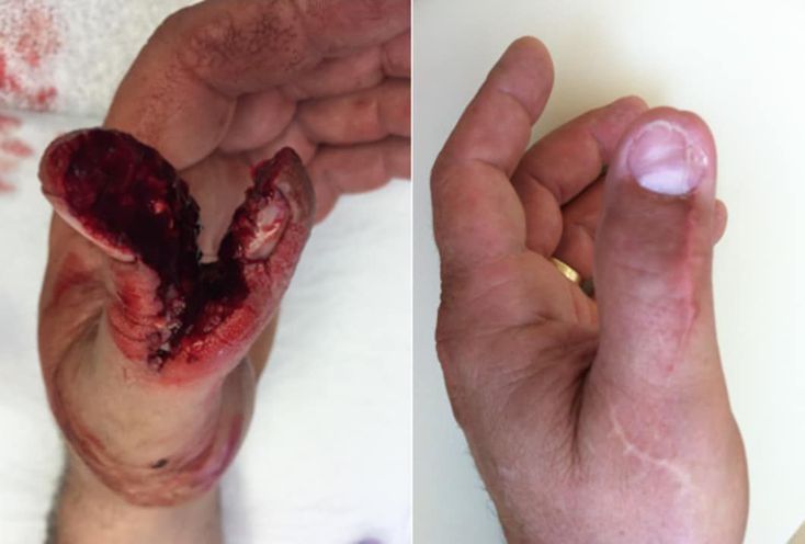 This patient had a table saw accident while at home. The blade cut the thumb in an unusual angle splitting the thumb along its axis. The surgeon reconstructed the bone and reattached the tendon. The patient was very compliant with therapy and was able to regain complete function of the thumb