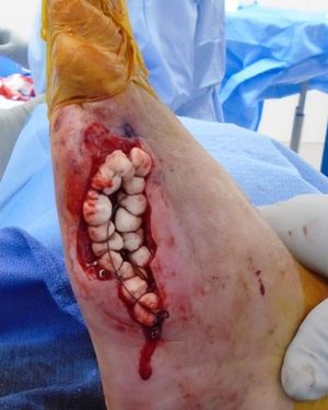 Who can guess what those white teeth-like structures are inside the wound?⬇️.This is a diabetic foot operation. The patient had irrigation and debridement with wide excision of all infected soft tissue and bone. The wound was then filled with antibiotic beads. Antibiotic beads have gained wide acceptance in orthopedics in the treatment of a variety of skeletal infections due to their ability to provide high concentrations of antibiotic at the site of infection while avoiding the complications associated with systemic toxicity