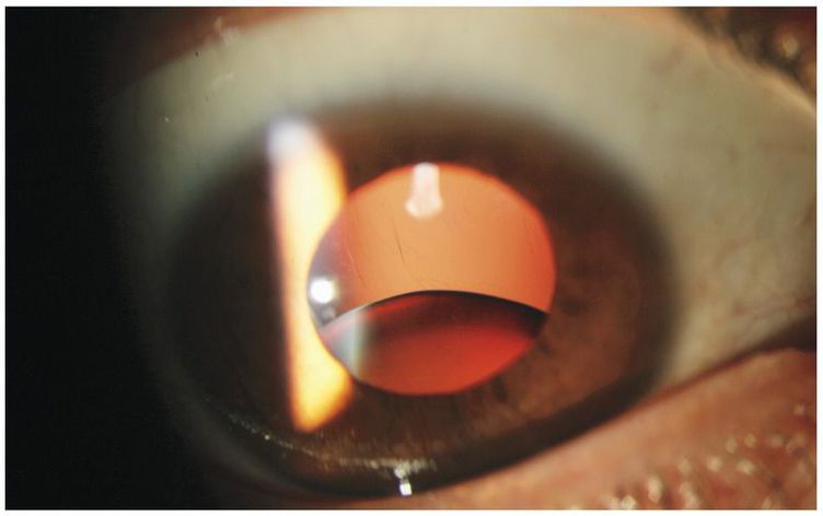 A 41-year-old man presented with progressive loss of vision in both eyes that was worse in the right eye than in the left. There was no history of trauma. His uncorrected visual acuity was 6/200 in the right eye and 20/100 in the left eye. Slit-lamp examination revealed ectopia lentis in both eyes, including near-complete inferior dislocation of the lens in the right eye (shown above) in addition to visible stretched zonules (the suspensory strands of the lens) and inferotemporal subluxation of the lens in the left eye. The patient’s mother has Marfan’s syndrome, and the patient has the elongated digits and pectus excavatum that are characteristic of the disease. He underwent pars plana vitrectomy and implantation of a scleral-sutured intraocular lens in the right eye. At final follow-up, the best corrected visual acuity in the right eye was 20/20, with correction of myopia. Marfan’s syndrome is associated with ectopia lentis in both eyes, a characteristic that may be subclinical. Indications for surgery include correction of an otherwise unmanageable difference in refractive power between the two eyes (anisometropia), excessive induced astigmatism, and complications of lens subluxation, including glaucoma, uveitis, and retinal detachment.
